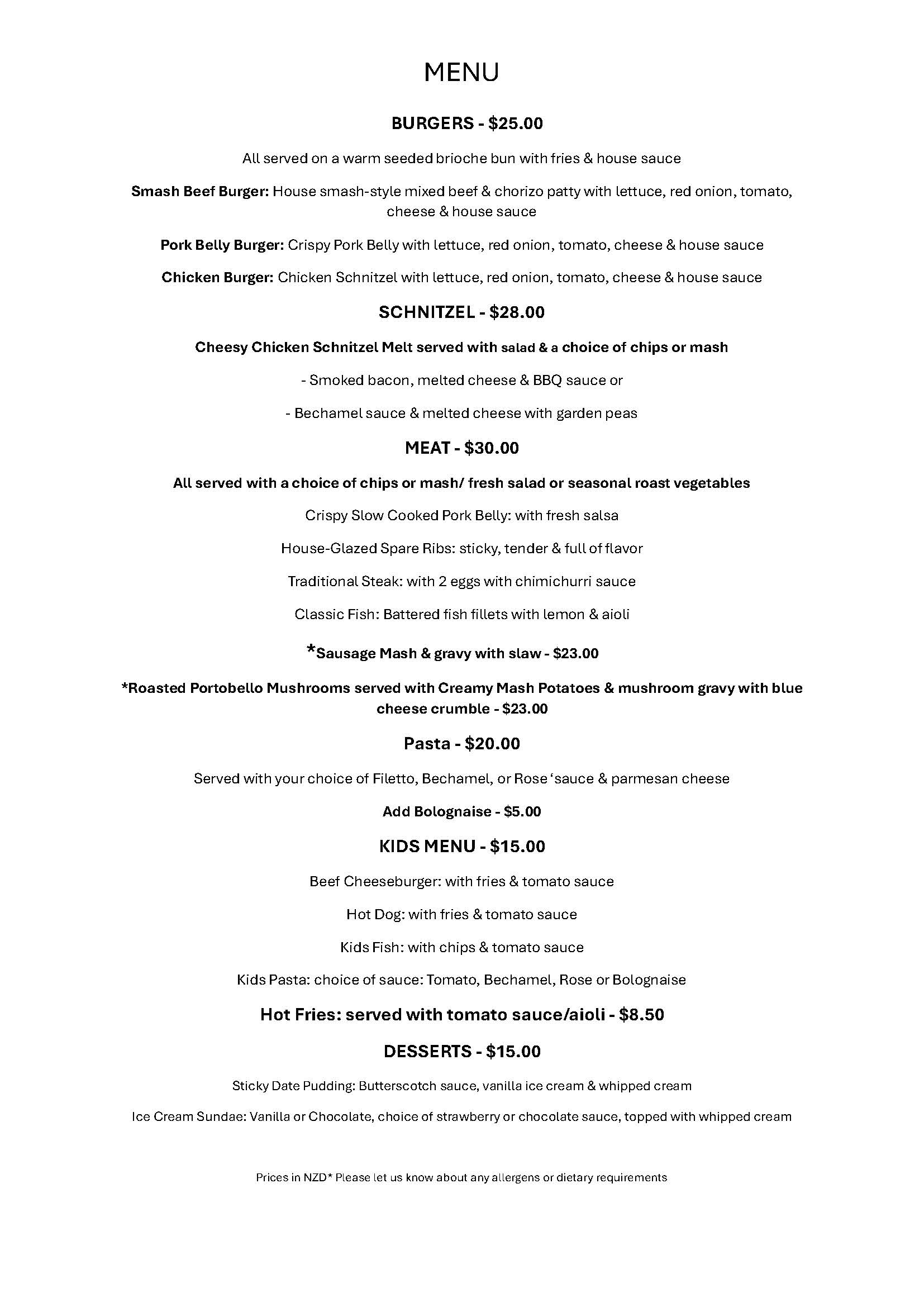 Menus are created to appeal to the community as a whole, with items that will appeal to all members of the community that love food. Bar food available at all times